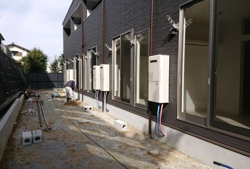 新築マンションの外構工事でベランダ部分と建物周りを人工芝と砂利で仕上げました‼